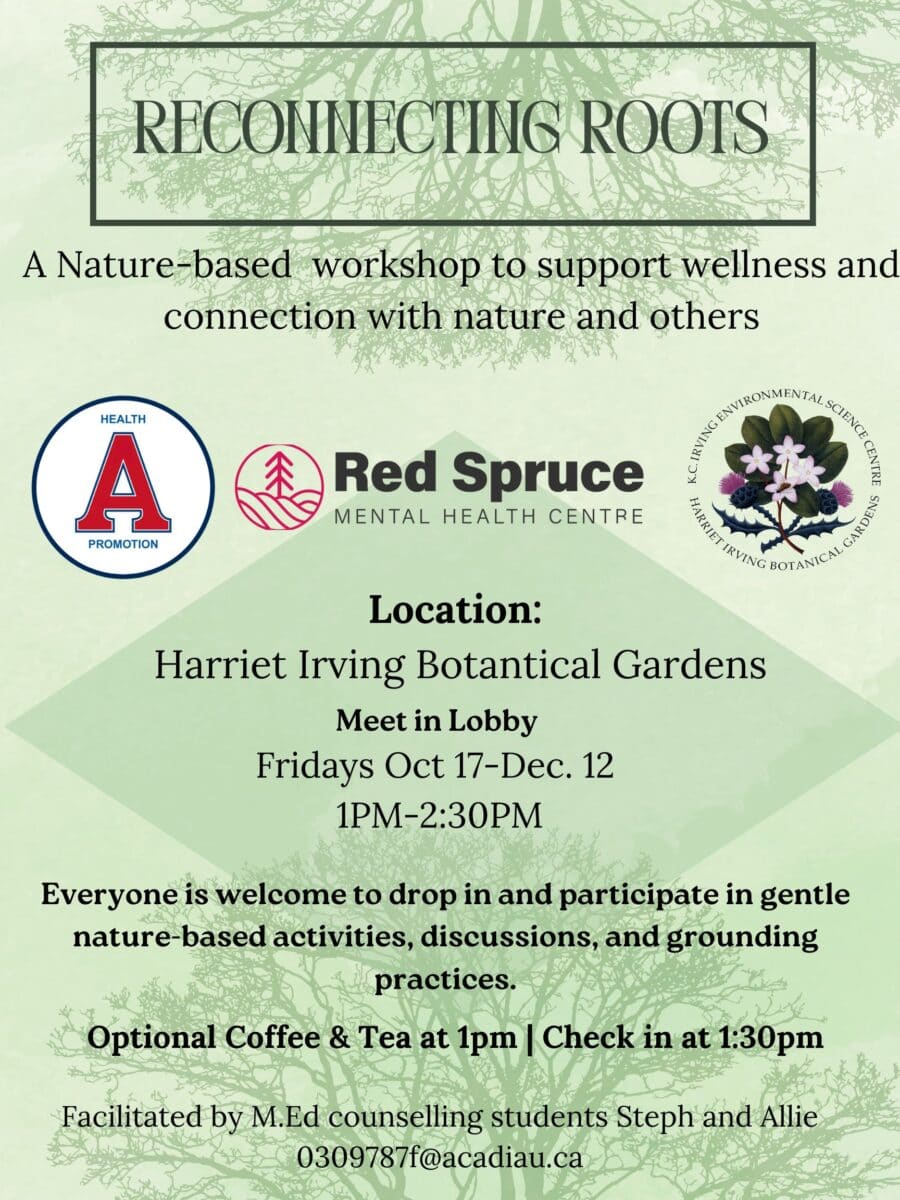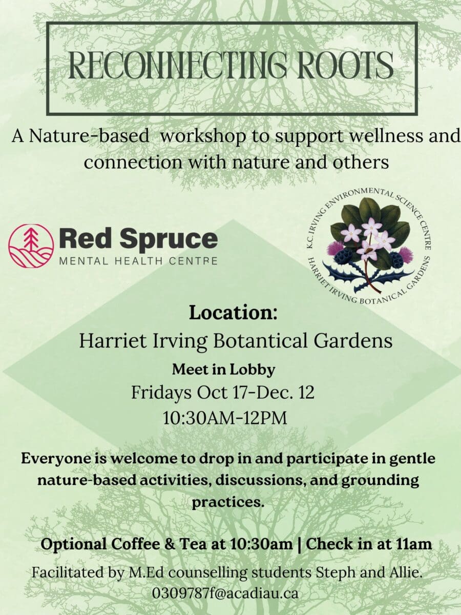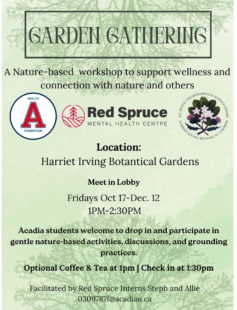 The Red Spruce Mental Health Centre is offering nature-based workshops in support of wellness and connection with nature and others weekly at the Harriet Irving Botanical Gardens this fall. Sessions facilitated by Acadia University Masters of Education Counselling Students Stephanie and Allie. Drop-in sessions for the community Friday Mornings 10:30 – 12 and for Acadia Students Friday Afternoons 1-2:30 from Oct 17 – Dec 12.